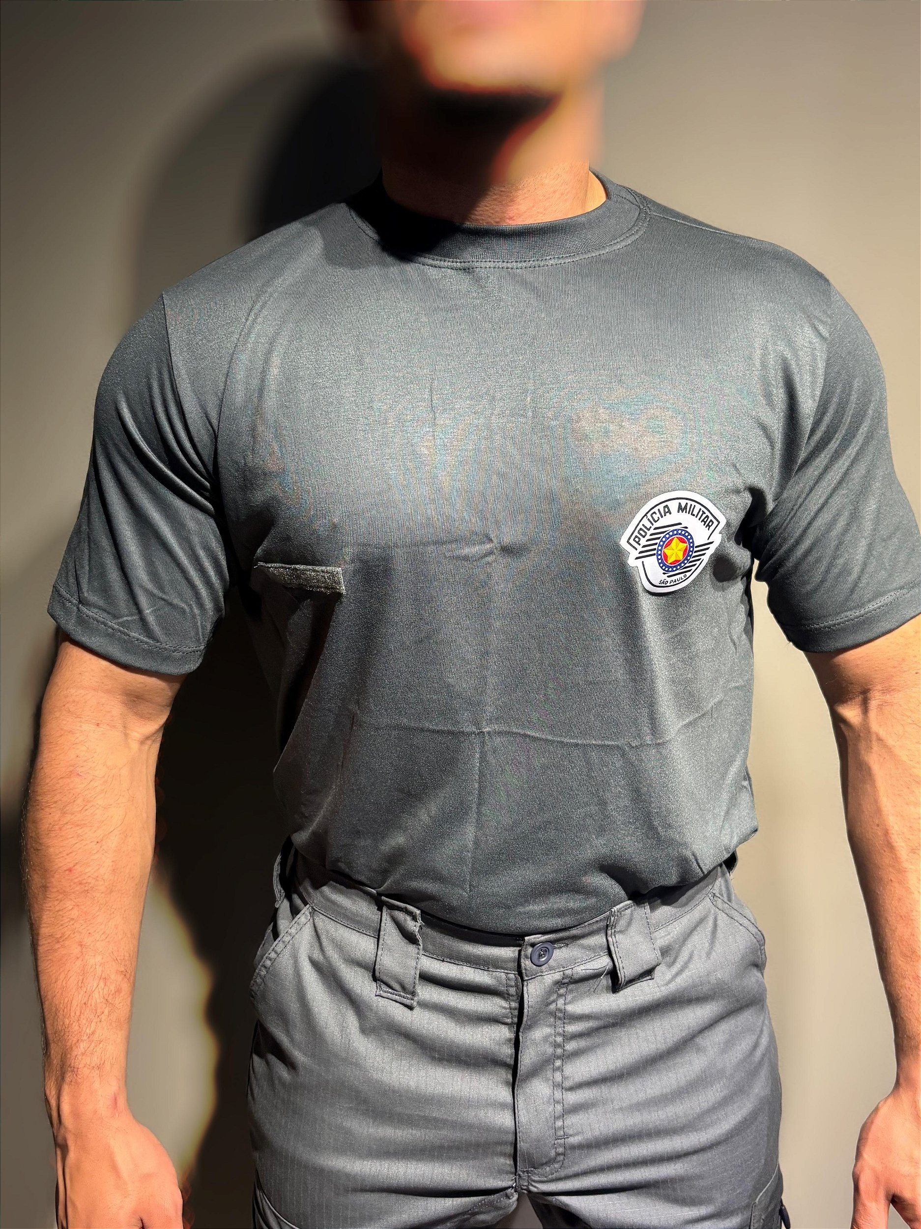 Peito lado direito: Patch bordado com brasão da Polícia Militar (micro bordado de alta definição).